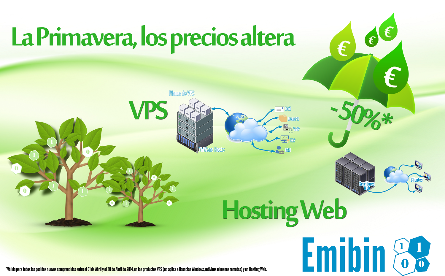 Recordar que sólo se aplicará a las nuevas contrataciones de productos y solamente durante este mes de primavera. De esta manera queremos dar a conocer nuestros productos y que más empresas puedan alojarse en Emibin. También aplica a los VPS a medida que podéis crear desde aquí.