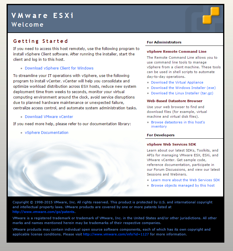 Ahora solo nos queda descargar y acceder a vSpere o vCenter para poder empezar a administrar nuestras máquinas. Para ello desde cualquier navegador siempre estando en la misma red que el ESXi meteremos la dirección IP asignada.