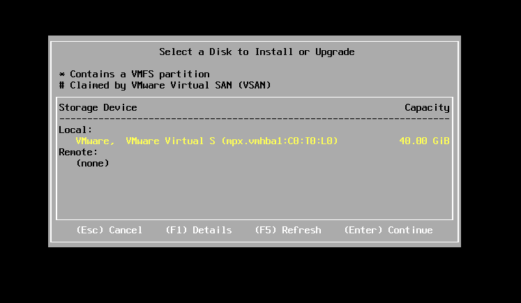 En la siguiente ventana seleccionaremos en qué almacenamiento queremos instalar ESXi, en nuestro caso el disco virtual que hemos creado con Workstation.