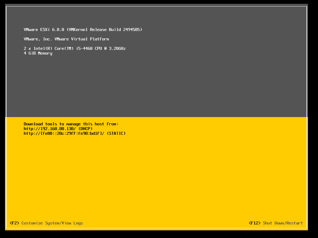 Después de reiniciar cargará nuestro nuevo sistema operativo en el cual sólo nos quedaría meter la configuración de red, para ello pulsando F2 en esta pantalla se nos abriría la página de configuración. En nuestro caso al ser una máquina virtual nos ha cogido la configuración de red de nuestro sistema.